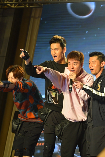 孙杨(左二)和张继科(右一)在真人秀综艺节目的发布会上。视觉中国供图