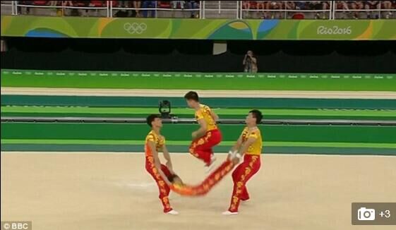 在本届奥运会的体操表演盛会上,中国体操队的四名运动员表演了跳绳,不过,中国体操队全程却没有用任何道具,所谓的绳子就是运动员自己,两位队员分别抓住这名扮演“绳子”的运动员的胳膊和腿,另外一人则负责跳跃,这样的表演确实很有新意。