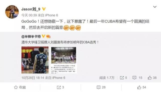 刘磊在微博中表示自己希望能够在本赛季帮助清华夺冠同时参加2017年的选秀大会。