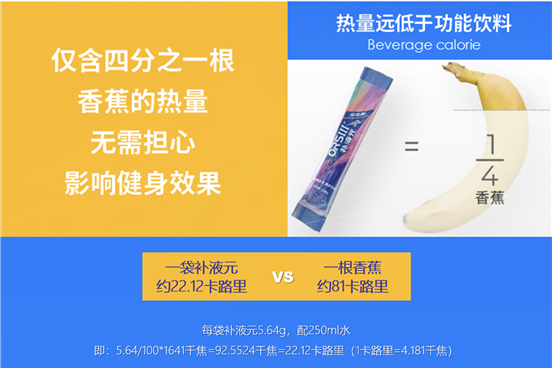一袋补液元的热量约为22.12卡路里,仅相当于1/4个香蕉的热量,对于运动人群来说毫无压力,特别适合减脂、塑形的人群饮用。不论是健身,还是日常锻炼,补液元都是运动爱好者的优选搭档!