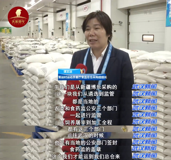 军运村运动员餐厅食品总仓采购组组长谭文运说到:“以牛为例,我们从新疆博乐采购,从遴选到监管都是当地农委和食药监、公安三个部门一起进行监管,饲养、屠宰到加工全程都有这三个部门参与,运往武汉的时候,也是当地的公安部门签封,只有见到这个盖章,才能运到我们总仓来。”