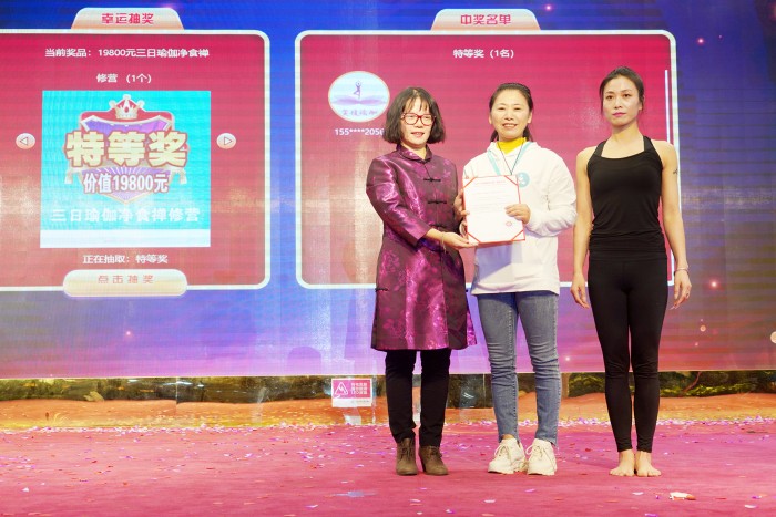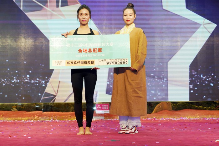 中国国际太极瑜伽大会与第十三届中国瑜伽体位大赛同时举行,大赛分为甲级组和乙级组,一等奖 陈世琴 获得29800元瑜伽净食禅修营大奖。