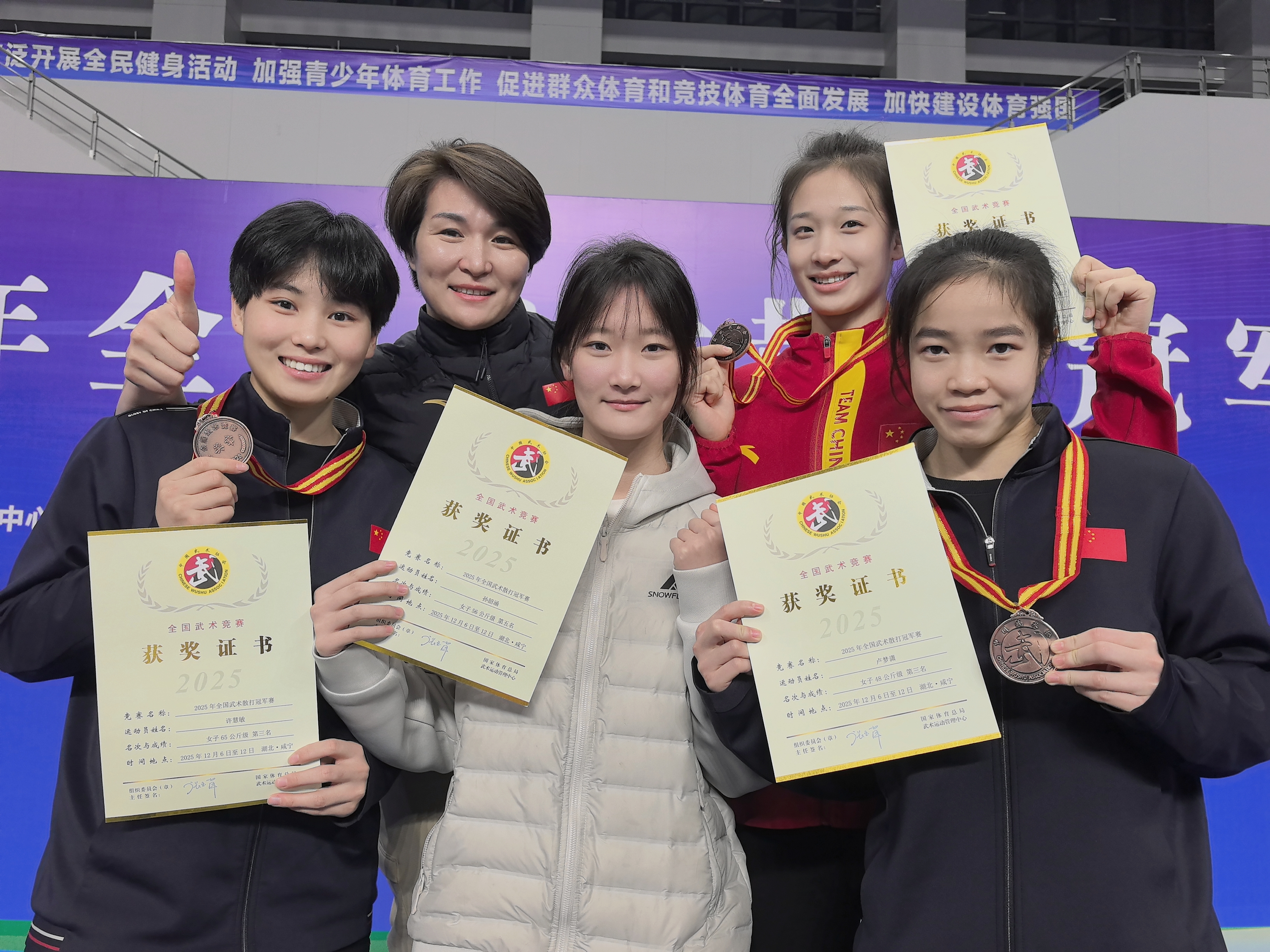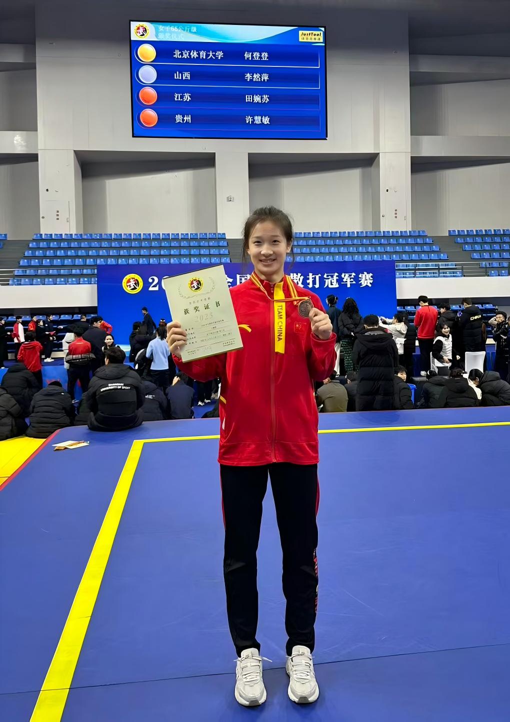 个人项目的角逐更是精彩纷呈。男子85kg级选手靳伟龙,凭借凌厉迅猛的攻势与沉稳稳定的发挥,摘得该级别铜牌;女子运动员卢梦潇(48kg级)、王晓曼(60kg级)、许慧敏(65kg级)三位选手发挥出色,均站上季军领奖台;孙韶涵、郭俊雯分别在女子56kg级、65kg级比赛中取得第五名的成绩。
