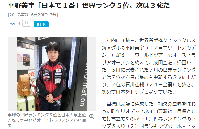 前日,国际乒联官方更新了7月份球员的最新排名,平野美宇再创新高,从第7上升到了第5,这也是日本球员近些年的最好排名,超过了之前石川佳纯的第6。虽说第5也是不错的一个排名了,但是平野美宇并不满足,毕竟只要不进前四,世界大赛就都有可能提前碰到中国女乒,因为最新一期排名,国乒已经是包揽了前四,平野美宇就再也不会有今年世锦赛上的好运气,进四强前一个中国球员都没碰到。
