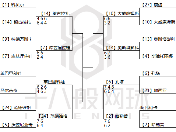 先行进行的女单比赛中,头号种子科贝尔和穆古拉扎上演前温网亚军对决。在失误频频以4-6丢掉首盘后,穆古拉扎却依然坚持积极的进攻逐渐手感回暖。她在后两盘频频上网压缩科贝尔的防守时间,底线稳定又不失凶狠,最终以两个6-4逆转。虽然此役过后科贝尔已经确定交出了烫手的世界第一,但其实她昨天的场上的状态的回勇表现却值得欣喜。或许放下了世界第一的包袱再出发,科贝尔又会领略新的网球境界吧~而在这场比赛前后,拉德万斯卡被克星库兹涅佐娃6-2 6-4横扫,沃兹尼亚奇被重炮范德维格7-6 6-4轰晕。“波兰三姐妹”上一轮携手晋级,这一轮集体回家。