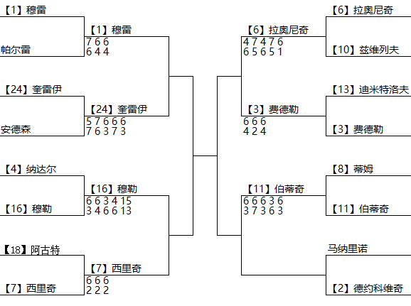 其他几场比赛中,伯蒂奇、拉奥尼奇、奎雷伊都历经五盘大战分别战胜蒂姆、兹维列夫与安德森,而西里奇则以三个6-2战胜阿古特成为了晋级最为轻松的人。