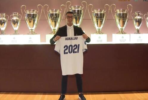 C罗与皇马的续约仪式在伯纳乌的主席包厢中进行,带着眼镜酷范十足,并与老佛爷合影。签字画押后,C罗手持印有2021的球衣拍照,现场还播放了C罗的宣传片。