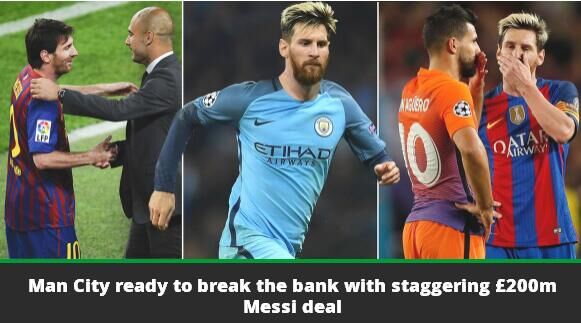 曼城也决定为梅西开出高工资,如果梅西愿意加盟,他可以在伊蒂哈德球场获得50万英镑的周薪。如果梅西加盟曼城,那么足坛的转会费纪录必然被刷新,此前最贵交易是曼联花费8900万英镑购入博格巴。