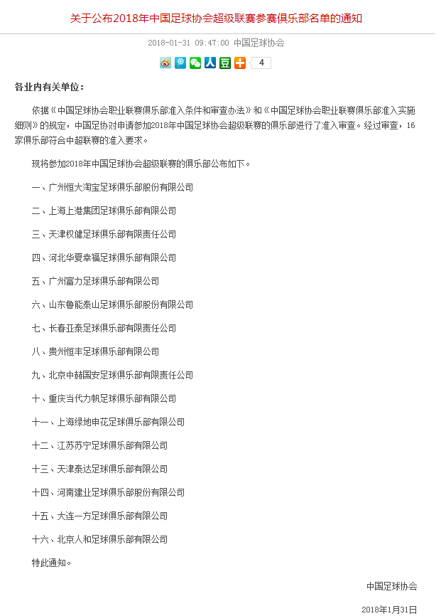 北京时间1月31日,中国足协相继公布了2018年中超、中甲联赛参赛俱乐部名单的通知,经过审查,32家俱乐部符合职业准入要求获得2018赛季参赛资格。