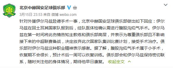球队官方消息:针对外援伊尔马兹赴德手术一事,北京中赫国安足球俱乐部做出如下回应:伊尔马兹在回土耳其国家队报到后,经队医体检确认需进行腹股沟疝气手术。伊尔马兹在第一时间将此伤情告知主教练和俱乐部高层,并表示为尊重俱乐部且不影响接下来的中超联赛备战,决定放弃此次国家队集训比赛计划,接受手术治疗。