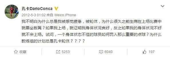 在2012年的亚冠小组赛对阵全北现代的比赛,孔卡仅仅踢了60分钟就被换下,这让“天体之王”相当不满。下场后他先是一脚踢翻了矿泉水瓶,又将毛巾重重地摔在地上。孔卡的冲动宣泄方式,一旁的李章洙都看在眼里。