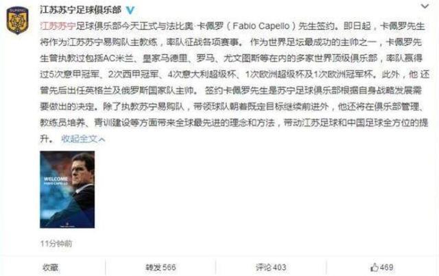 6月11日晚,卡佩罗终于在千呼万唤中正式成为江苏苏宁的主帅。据相关消息显示,苏宁与卡佩罗签署的是一份年薪1000万欧元,为期一年半的合同;回顾卡佩罗以往执教俱乐部的经历,如果苏宁在接下来运作得当,将很有延续卡佩罗的一项神奇纪录、成为下赛季联赛冠军的有力争夺者。