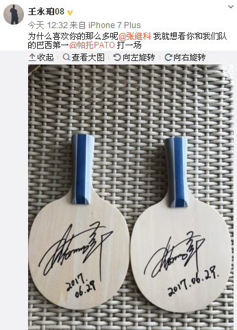 获胜了,心情很happy!活宝帕托就不用说了,他曾经因为骑车撒把,被天津交警批评教育。随后又大跳广场舞,踢毽子。当然,有传闻帕托乒乓球打的非常好,实力了得,是权健队内第一高手。故此,王永珀特意晒出张继科签名球拍平,准备让帕托和藏獒比拼一场。