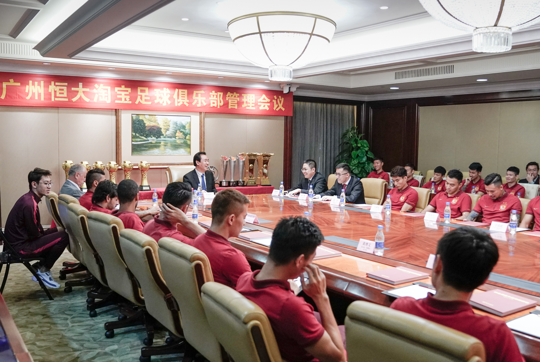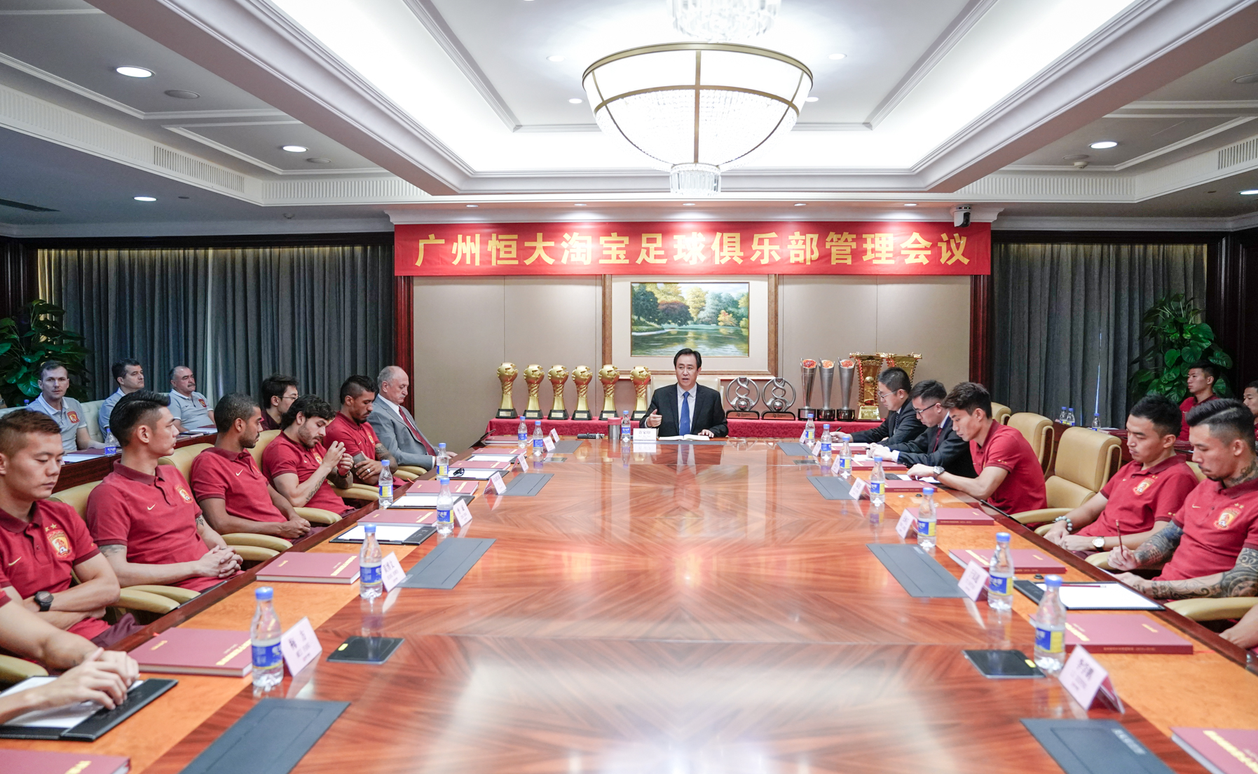 7月10日,恒大淘宝足球俱乐部召开半程总结会。会议由恒大集团分管足球的副总裁刘永灼主持,恒大集团董事局主席许家印对恒大队提出了四点要求:要再接再厉,再破纪录;要调整心态,提高认识,转变意识;要严守纪律,从严管理;要同心协力,坚强拼搏,打好每一场,实现四冠王。