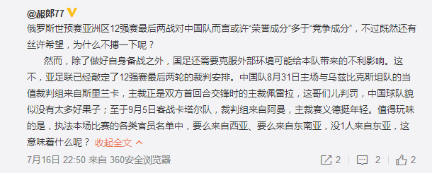 肖赧在微博中透露:“除了做好自身备战之外,国足还需要克服外部环境可能给本队带来的不利影响。这不,亚足联已经敲定了12强赛最后两轮的裁判安排。中国队8月31日主场与乌兹比克斯坦队的当值裁判组来自斯里兰卡,主裁正是双方首回合交锋时的主裁佩雷拉,这哥们儿判罚,中国球队貌似没有太多好果子;至于9月5日客战卡塔尔队,裁判组来自阿曼,主裁赛义德挺年轻。值得玩味的是,执法本场比赛的各类官员名单中,要么来自西亚、要么来自东南亚,没1人来自东亚,这意味着什么呢?”