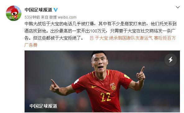 在长沙击败韩国队的赛后,于大宝成了英雄和功臣,其手机被打爆不说,有不少商家瞅准时机,希望蹭热度。有朋友给于大宝100万人民币,希望他发布一条消息。要知道在那天夜里,只要于大宝发微博,关注度都会是最强的。但是大宝还是拒绝了,他的理由是:我现在是中国国家队球员的状态。